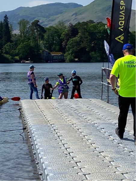 Saturday morning arrived. I ate a light breakfast and headed to the Festival Village to get the ferry to the start line. Swim folks are all different shapes, sizes and ages which is comforting. Several, but not all, had tow-floats. One of the swimmers, a chap from Motherwell, said he thought they were compulsory but this wasn’t the case. I am glad I had mine as I had practised swimming with it and accessing my snacks and water from it. We boarded the ferry, heading to the other side of the lake. There was talk about our start jetty being out of commission the previous year, but that it ought to have been repaired. Despite this being the case, we were dropped at the next jetty about a 20-minute walk away on scree paths! I was glad of my swimming bootees on this occasion, those with bare feet struggled on the rough paths. Finally, we assembled at the correct jetty, around 15-minutes late.